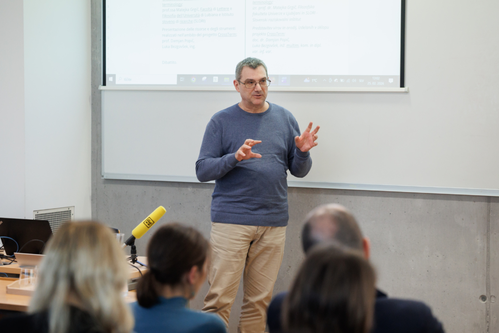 Luka Bezgovšek je predstavil vire in orodja, izdelana v sklopu projekta CrossTerm ter pojasnil, kako deluje platforma za terminološko standardizacijo.