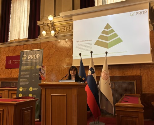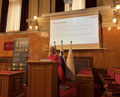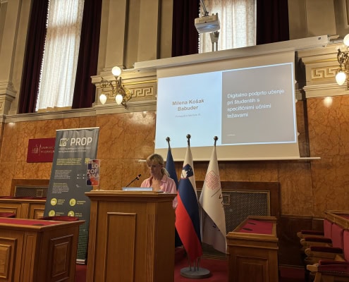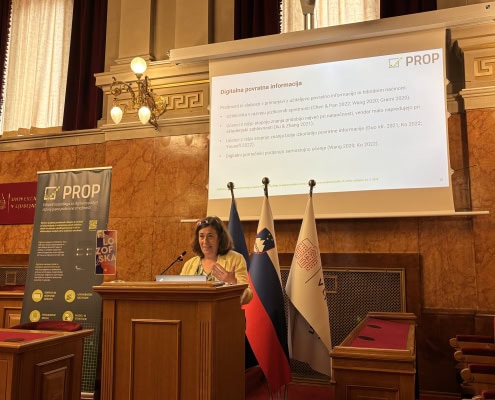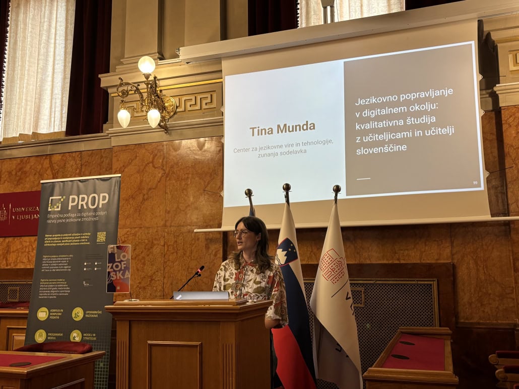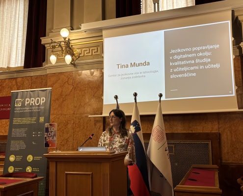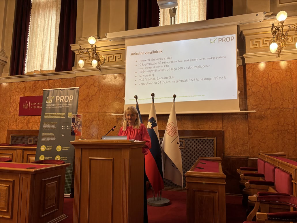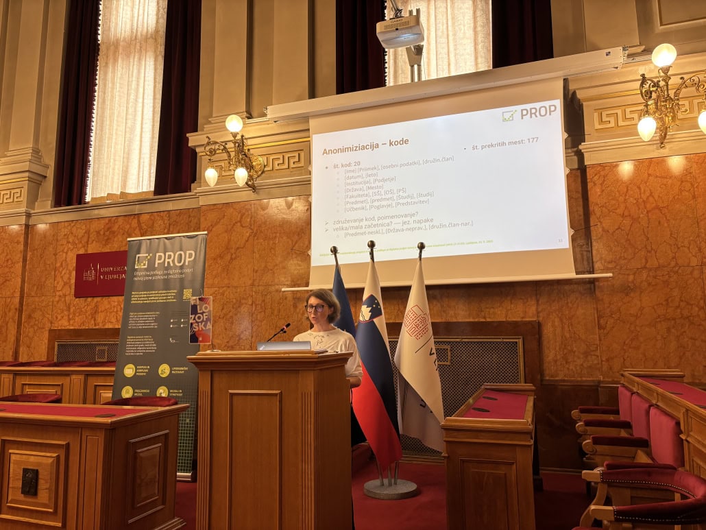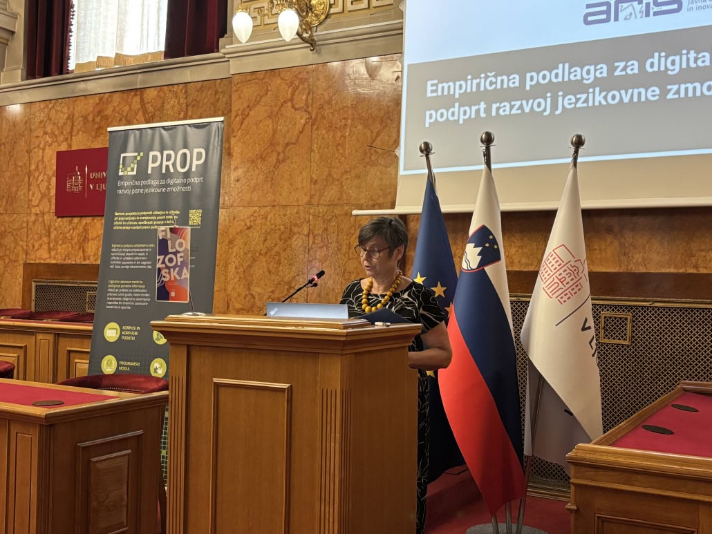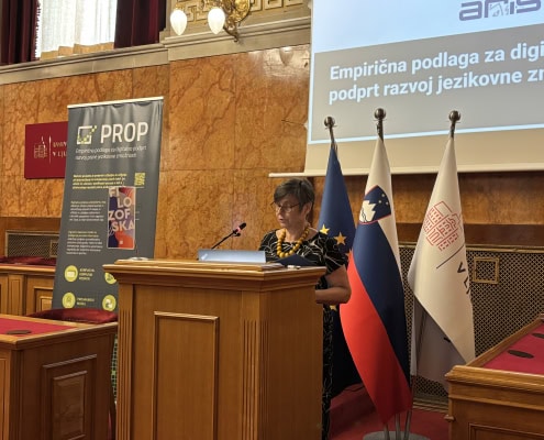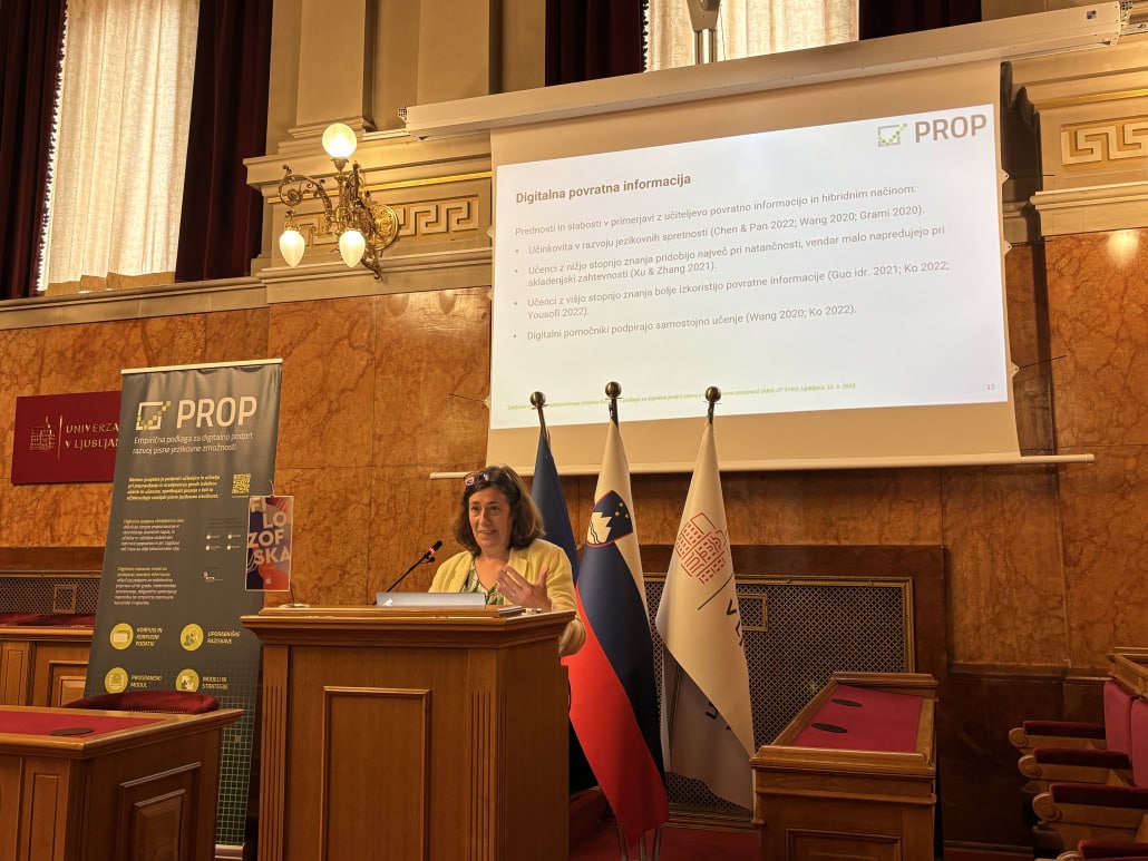Vodja projekta dr. Špela Arhar Holdt je predstavila rezultate projekta PROP. Ob predstavitvi je poudarila, da: “Pisanje zahteva vajo, vaja pa zahteva popravljanje. Priprava povratne informacije na pisanje zahteva od učiteljev veliko časa in tudi podprtost z ustreznimi opisniki, kazalniki in podatki o sodobni rabi. Pri tem lahko digitalne tehnologije učiteljem in učiteljicam pomagajo in olajšajo delo.”