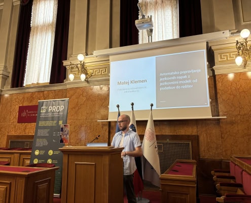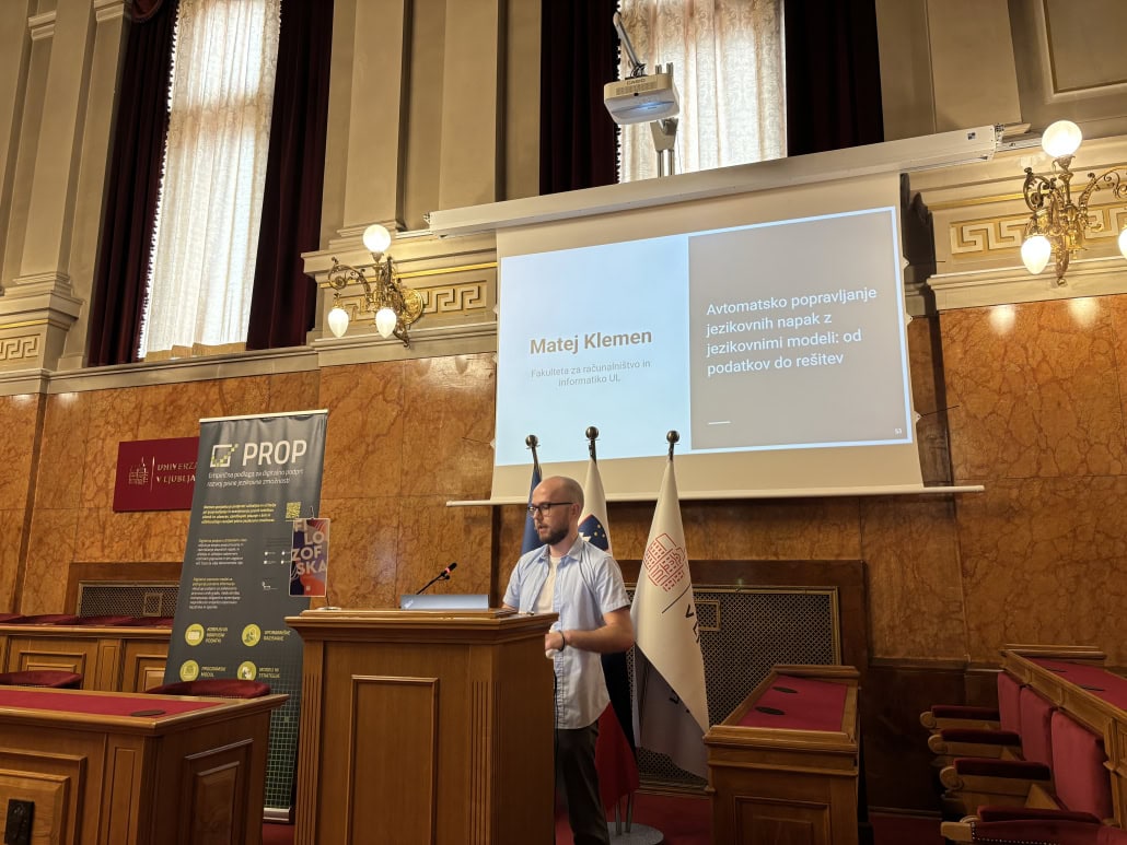 Matej Klemen je predstavil razvoj jezikovnega popravljalnika na podlagi jezikovnih modelov ter proces od pridobivanja podatkov do učenja modelov in evalvacije. Ob tem je izpostavil izziv pri dostopu do kvalitetnih podatkov. Jezikovni modeli se namreč učijo na velikih količinah učnih podatkov, ki pa jih v slovenščini primanjkuje.