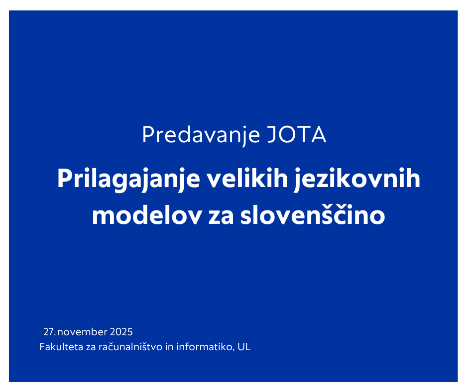 Vabimo vas na predavanje JOTA, na katerem bo Tomaž Savodnik (Zavod za informacijsko družbo) predstavil svoje izkušnje pri prilagajanju velikih jezikovnih modelov za slovenščino. Predavanje bo v četrtek, 27. novembra 2025 ob 13h na UL FRI (Večna pot 113, Ljubljana) v predavalnici P04.